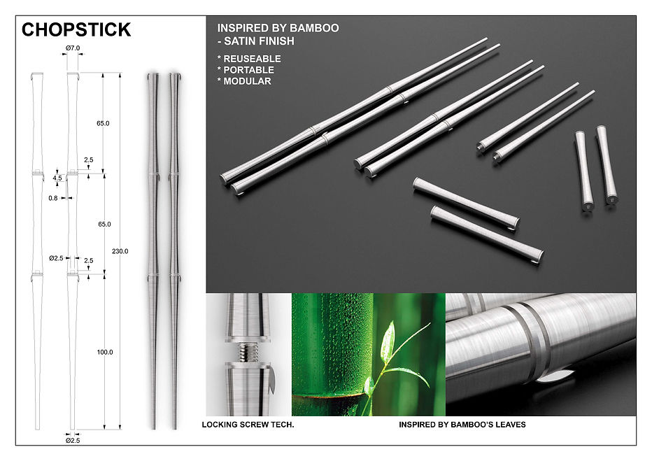 此设计概念来自于竹。竹是高雅、纯洁、虚心、有节的精神文化象征,竹是君子的化身,乃“四君子”中的一份子。竹、梅花和松是“岁寒三友”,代表着坚持。此设计可让客户随意调节长度,大人可使用三节段的设计,小孩可使用两节的筷子。因设计采取竹的元素,竹边上的小叶子可防止筷子在平面桌上旋转。